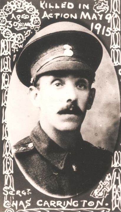 Charles Carrington served with the 4th Battalion Royal Welsh Fusiliers and died in action on 9th May 1915. Charles was interested in a military life, enlisting in the Territorial Force (the volunteer reserve component of the British Army in existence from 1908 until 1920) for four years' service on 8th July 1908, and re-enlisting for a further four years on 9th July 1912. He worked for the Ruabon Coal Company whilst serving as a volunteer reserve soldier, until he was called up for active service on commencement of the First World War.