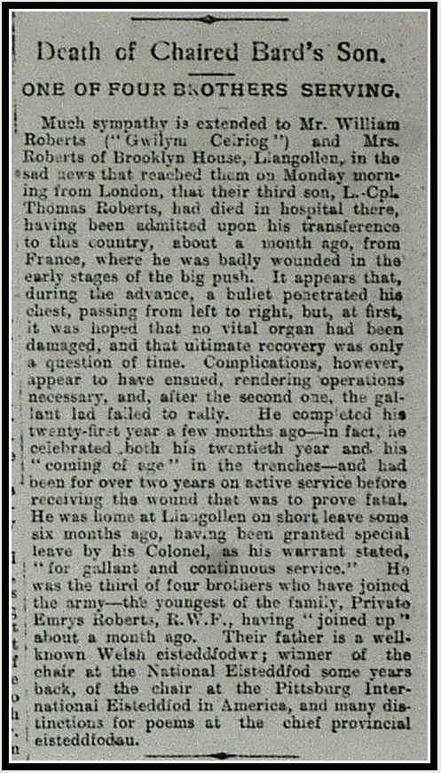 Report of Thomas Roberts' death in the Llangollen Advertiser of 27th April 1917