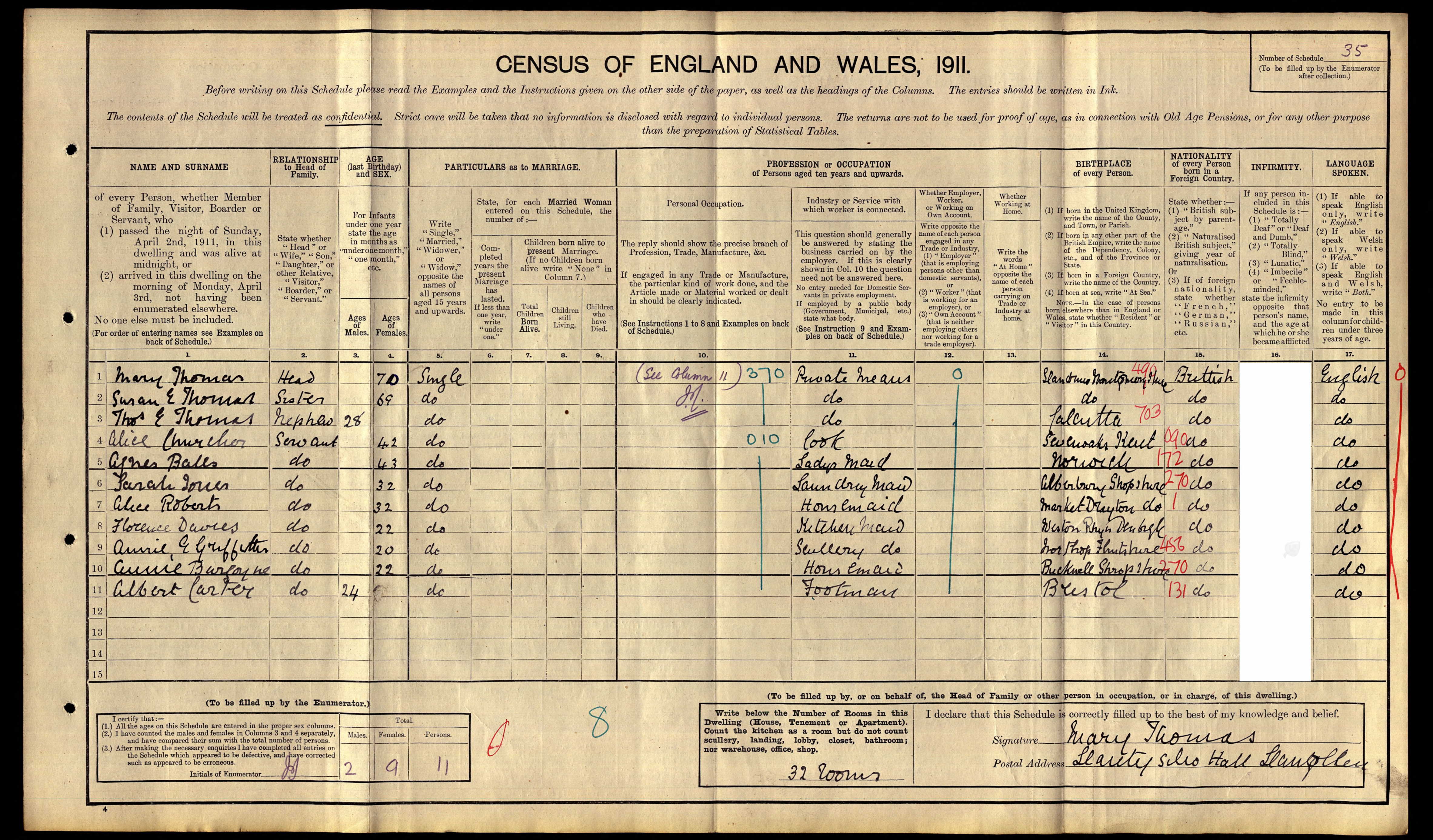 1911 Census showing George's brother Thomas at Llantysilio Hall with their aunts