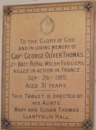 A plaque for George Oliver Thomas in Llantysilio Church erected by his aunts at Llantysilio Hall |